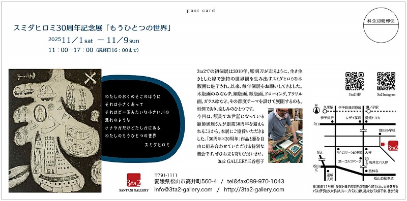 3ta2での初個展は2010年。彫刻刀が走るように、生き生きとした線で独特の世界観を生み出すスミダヒロミの木版画に魅了され、以来、毎年個展をお願いしてきました。